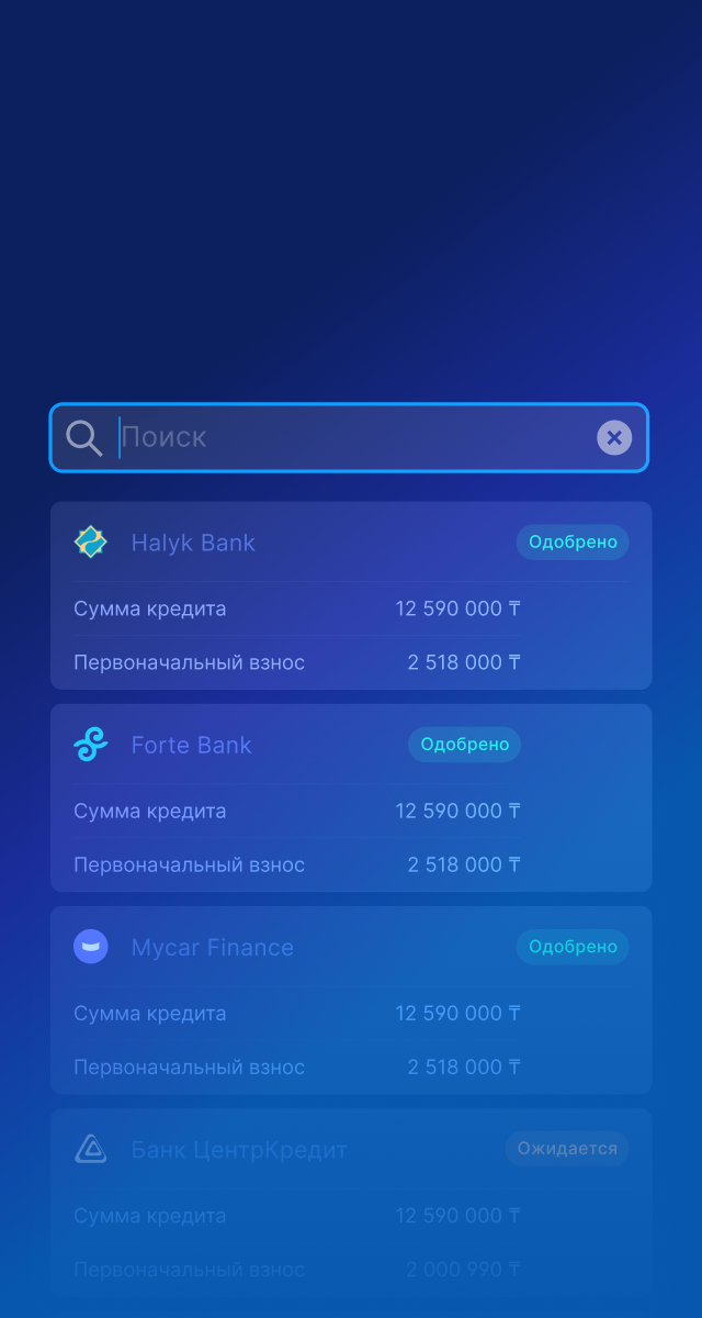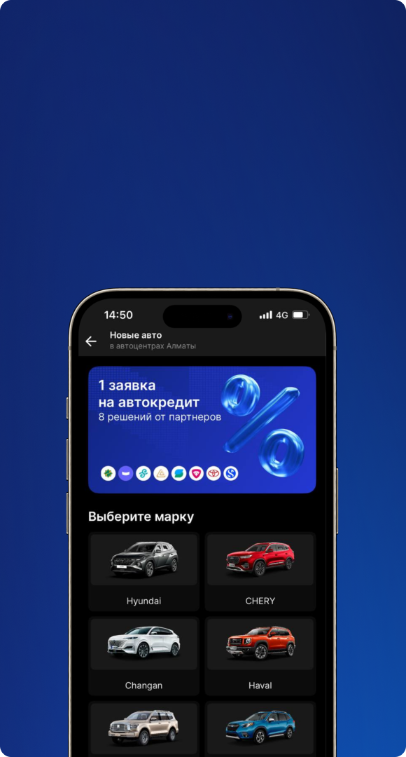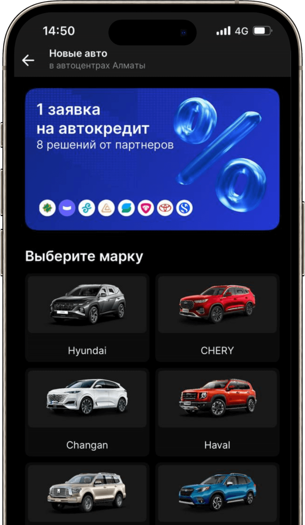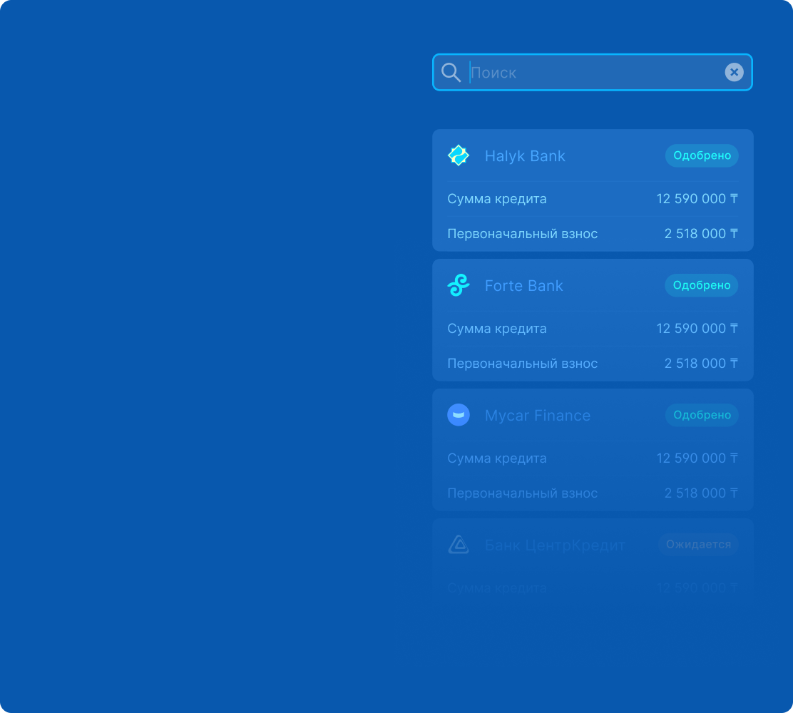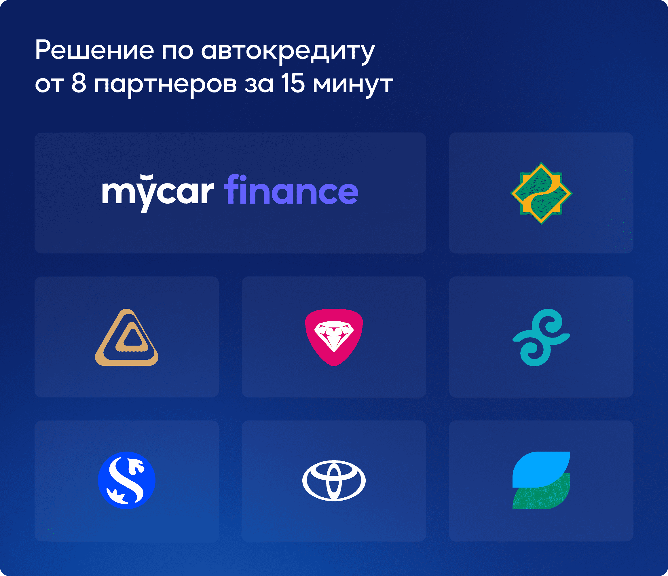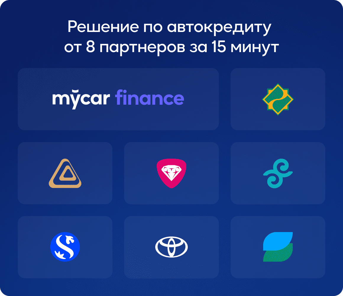 Вы получите ответы от следующих партнеров: Mycar Finance, Банк ЦентрКредит, Eurasian Bank, Halyk Bank, Forte Bank, Sapa Digital Finance, Shinhan Finance, Toyota Financial Services