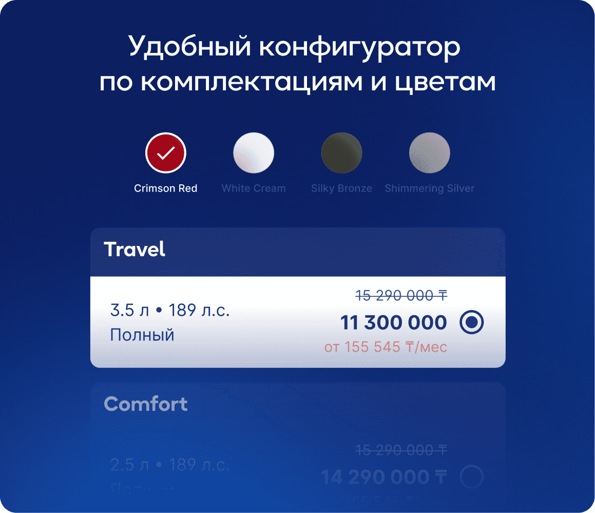 Выберите автомобиль, цвет, комплектацию и удобный способ оплаты